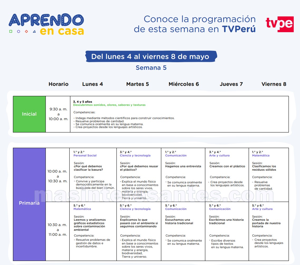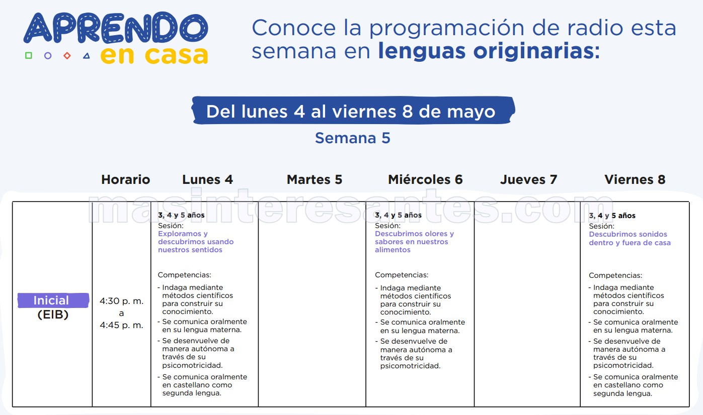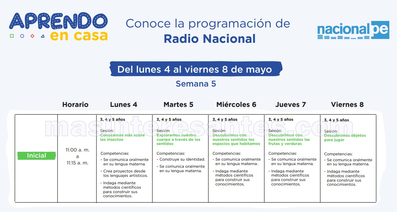 El Ministerio de Educación dió a conocer la Programación de la Semana 5 de la Estrategia de «Aprendo en casa» que corresponde desde el lunes 4 de mayo al viernes 8 de mayo. Descargue toda la programación en pdf aquí. A continuación, la programación en Radio y Tv de «Aprendo en casa».