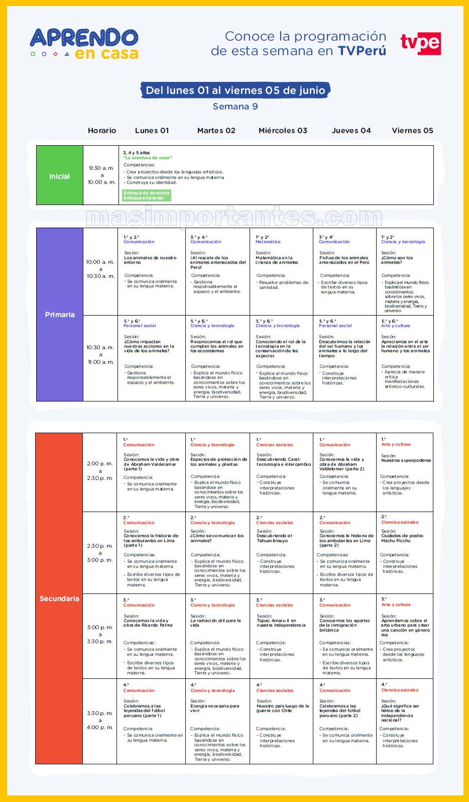 El Ministerio de Educación da a conocer la Programación de la plataforma Aprendo en casa semana 9 horario en Radio y TvPerú (Canales privados para 5º de secundaria) para los niveles de Inicial, Primaria y Secundaria. Aprendo en casa semana 9 desde el lunes 1 al 5 de junio.