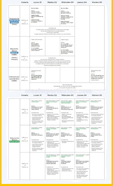 Los medios correspondientes son en TvPerú para los niveles de Inicial, Primaria y Secundaria, para 5to de secundaria se dará en los canales privados de América, Frecuencia Latina, ATV y Panamericana. El otro medio es por Radio Nacional según programación para inicial, primaria y ecundaria. Descargue en formato pdf o amplíe la imagen según corresponda.
