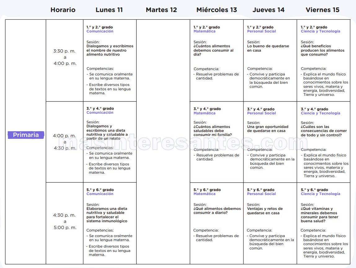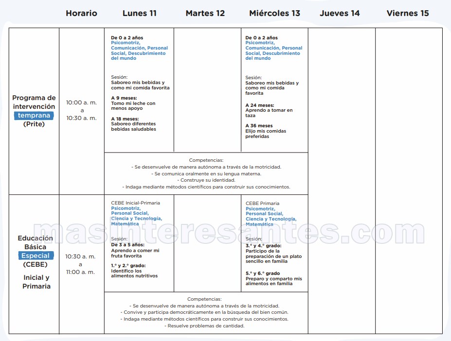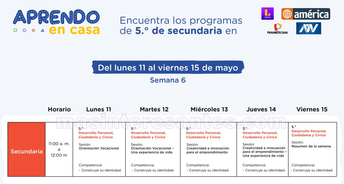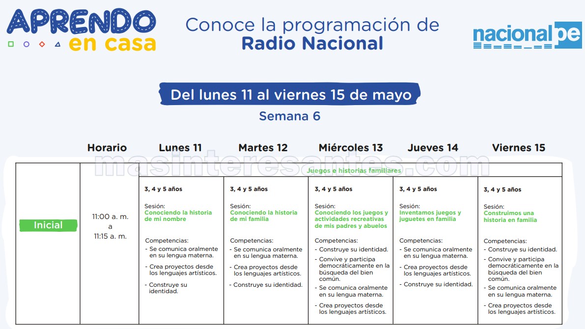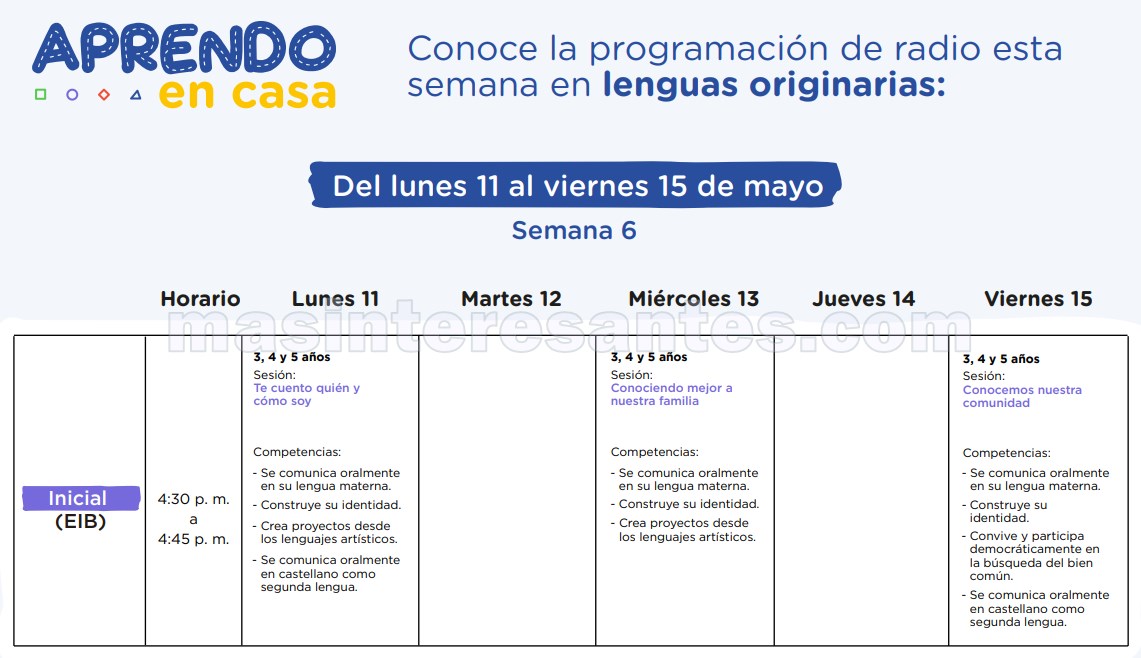 El Ministerio de Educación a través de la Estrategia de «Aprendo en casa» de Perueduca hace de conocimiento la Programación de la 6ª Semana (11 al 15 de mayo) por Radio y Televisión para los niveles Inicial, Primaria, Secundaria y otros. vea en las siguientes imágenes la programación que le corresponde. Descargue toda la programación en pdf aquí.