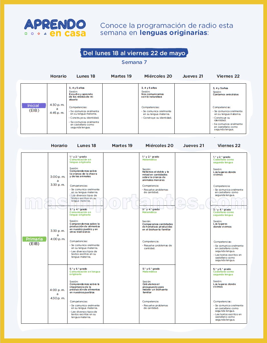 El Ministerio de Educación pone al alcanse la Programación de la Semana 7 de «Aprendo en casa». Vea a continuación la programación por Radio y Tv de Educación Inicial, Primaria y Secundaria del lunes 18 al 22 de mayo.